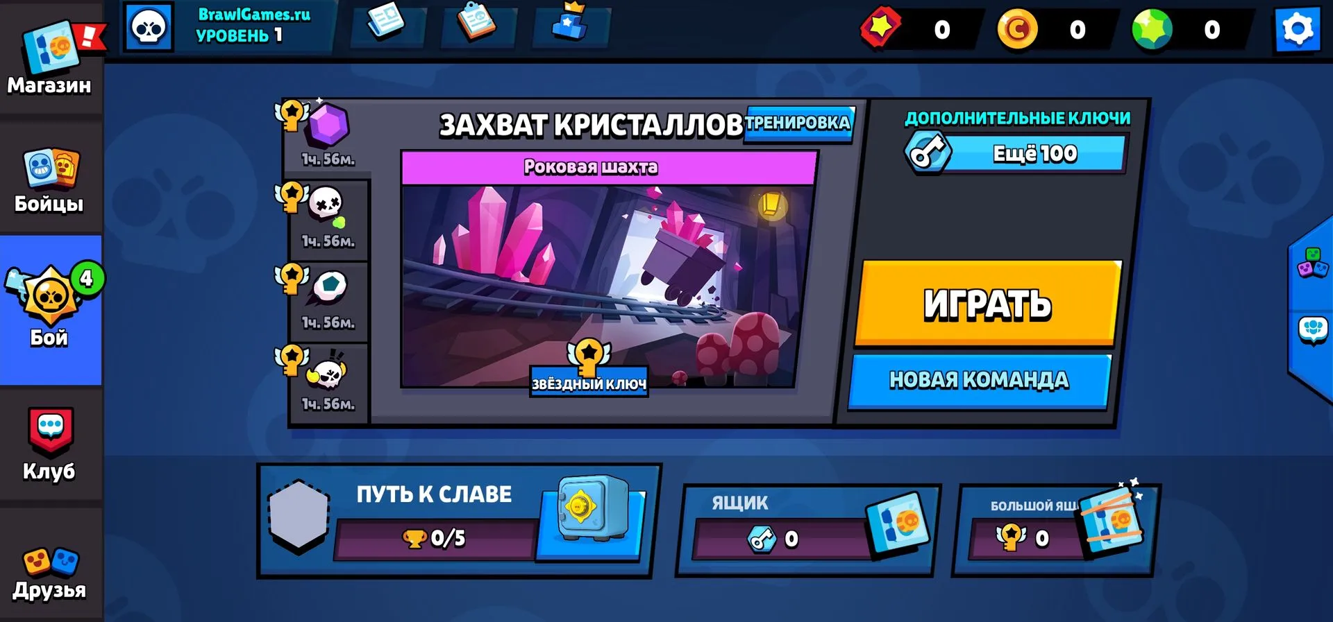 Между битвами игроки возвращаются в главное меню, где на вырученные кристаллы и монеты можно открыть ящики с полезными предметами и новыми бойцами.